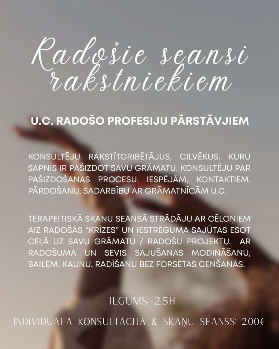 Lai iegādātos šo konsultāciju & seansu rakstniekiem (un citu radoši profesiju pārstāvjiem), klikšķini uz bildes. Te Tu vari ievadīt savus rekvizītus vai vienkārši savus datus - to mērķis ir, lai varu ar Tevi sazināties. Pēc apmaksas saņemšanas, es sazināšos ar Tevi par dienu un laiku, kurā organizēsim Tavu seansu.